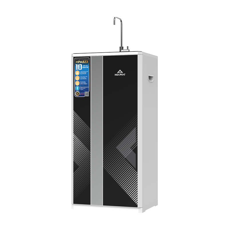 Máy lọc nước RO dành cho nước lợ, nước đá vôi HPA823 được trang bị 10 cấp lọc, trong đó 4 lõi lọc thô chính là “vũ khí lợi hại” để xử lý nguồn nước đầu vào nhiễm lợ, nhiễm đá vôi; gồm lõi PP 5 micron, lõi than hoạt tính OCB, lõi Cation, lõi than ép CTO