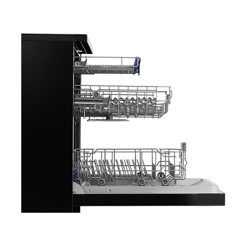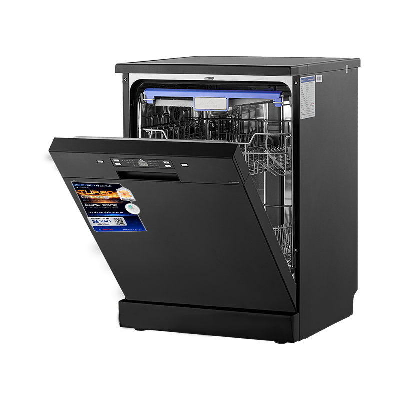 - Hệ thống giàn 3 giá đỡ linh hoạt, chứa được 14 bộ bát đĩa với 7 chế độ rửa