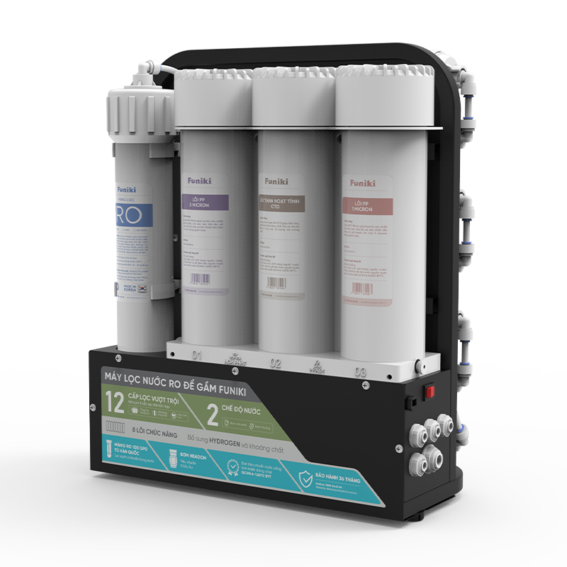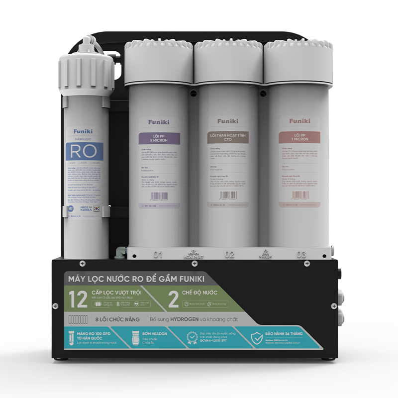 | Hệ thống lọc thô: | Cụm cốc lọc thô tích hợp (3 lõi: PP 5 micron, Than hoạt tính, PP 1 micron) |