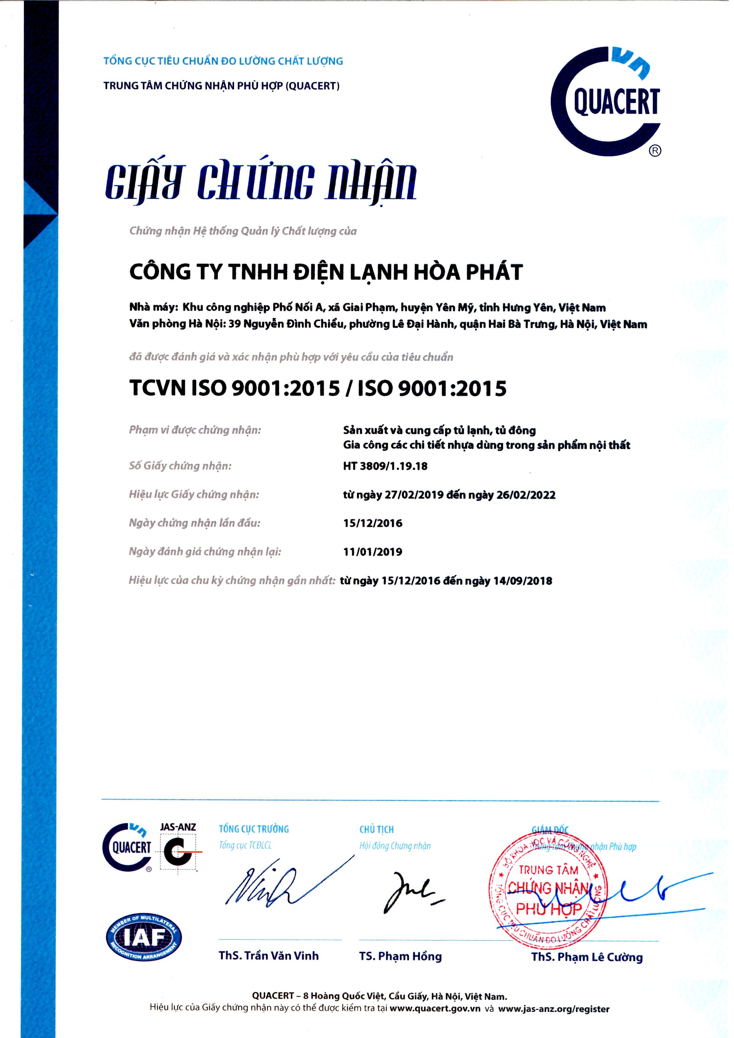 Ngày 27/02/2019, Công ty TNHH Điện Lạnh Hòa Phát đã được Tổng cục tiêu chuẩn đo lường chất lượng QUACERT cấp chứng nhận Hệ thống quản lý chất lượng theo phiên bản ISO 9001:2015. Phiên bản này là một bước ngoặt quan trọng trong lịch sử phát triển của tiêu chuẩn ISO 9001 được xây dựng dựa trên hai hệ thống quản lý hiện đại bao gồm hệ thống quản trị rủi ro và quản lý sự thay đổi. Phiên bản mới yêu cầu và bắt buộc hệ thống ISO phải là một giải pháp khoa học giúp doanh nghiệp kiểm soát và giảm thiểu các rủi ro phát sinh từ cả bên trong lẫn bên ngoài doanh nghiệp. Để đạt được chứng nhận ISO 9001:2015, Công ty TNHH Điện Lạnh Hòa Phát đã tiến hành tổ chức hoạt động và thiết lập kế hoạch kiểm soát gắn với quy trình hóa tất cả các hoạt động sản xuất kinh doanh trong toàn Công ty. Công tác kiểm tra và đo lường chất lượng cũng được quy định chặt chẽ cho từng khâu trong quá trình nghiên cứu, sản xuất, kiểm tra và triển khai thường xuyên nhằm giảm thiểu các sai sót có thể xảy ra.